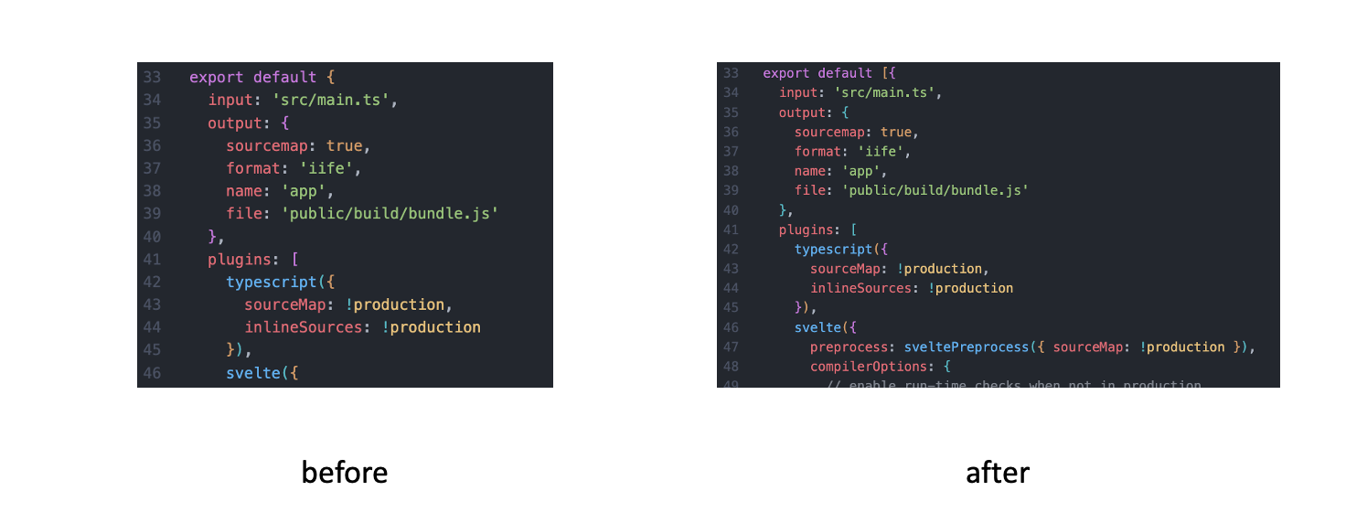 기본 rollup.config.js의 default export는 Svelte 프로젝트 엔트리 .ts 파일의 번들링 과정을 정의한 오브젝트로 되어있을 것이다. 우리는 Rollup을 이용해 Svelte 프로젝트 뿐만 아니라 background.ts의 빌드 및 번들링도 함께 처리해야하기 때문에 이걸 배열로 감쌀 것이다.